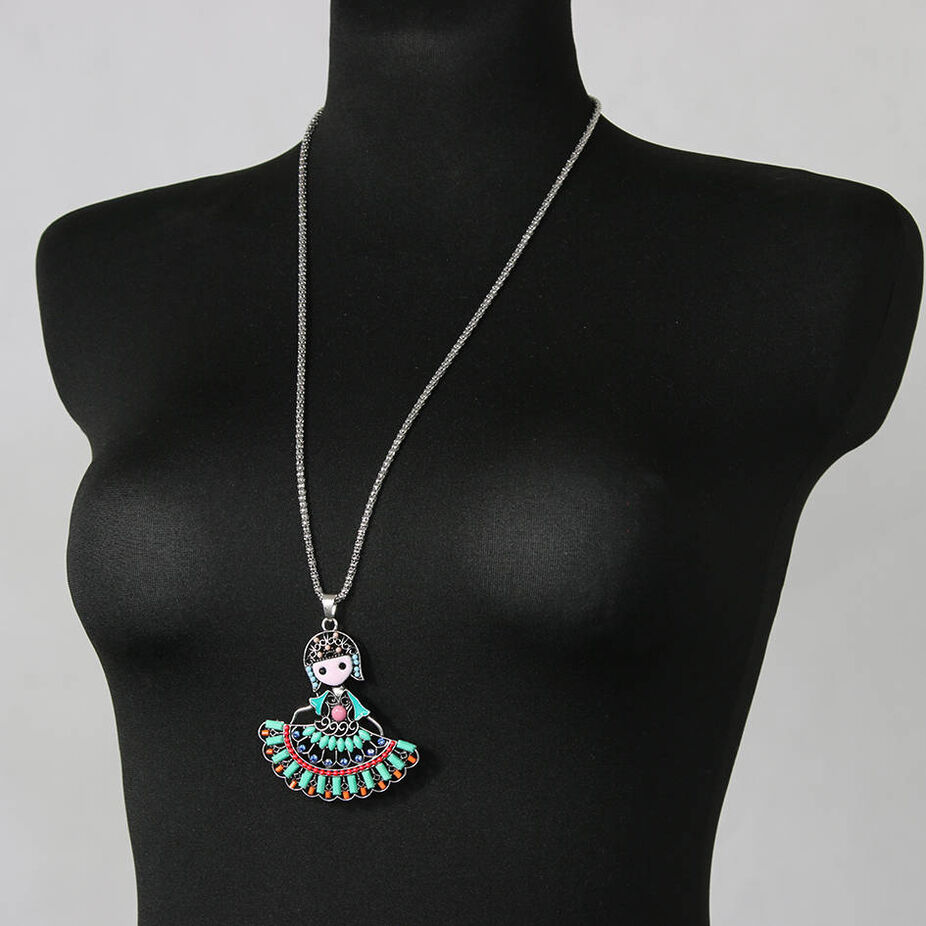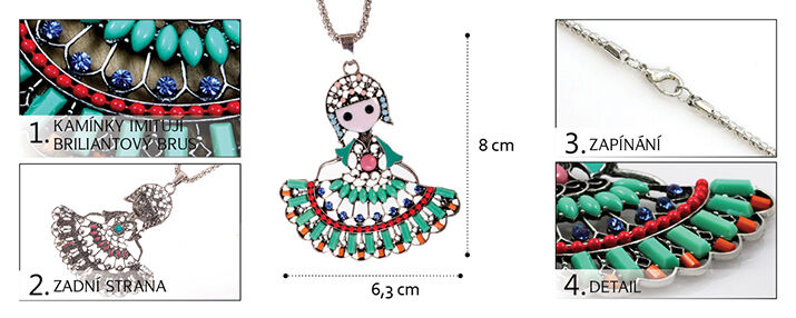 Jednobarevné oblečení zaručeně rozzáří svou barevností roztančená panenka. Tento výrazný náhrdelník se hodí pro ženy, které mají rády větší šperky a chtějí upoutat pozornost okolí. Panenka je navržena v etno stylu, je vyrobena z bižuterního kovu, na kterém je vrstva patiny. Celý přívěsek je zdobený různobarevnými korálky a kamínky. Přívěsek je zavěšen na dlouhém řetízku z bižuterního kovu barvy stříbrné.