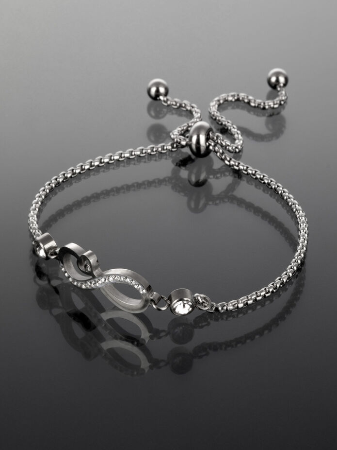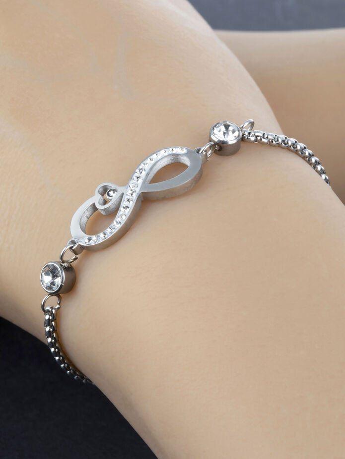 Krásný náramek z chirurgické oceli s nekonečnem s čirými krystaly je skvělým doplňkem k jakémukoliv outfitu.