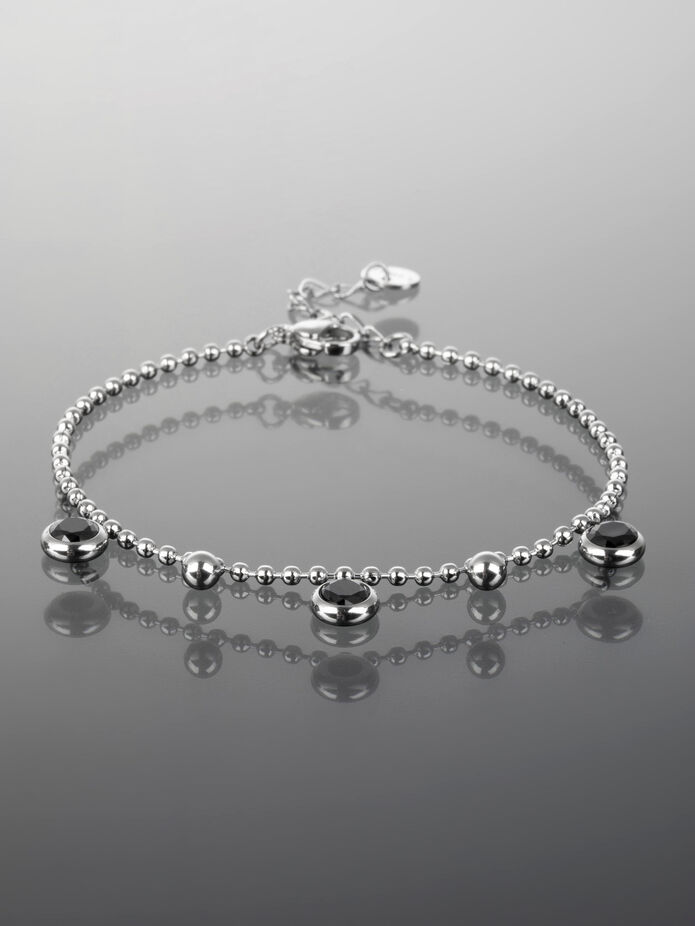 Krásný náramek z chirurgické oceli s přívěsky koleček s barevnými krystaly je skvělým doplňkem k jakémukoliv outfitu. Délka náramku je nastavitelná cca od 18 do 21 cm, průměr kroužků je 0,6 cm. Zapínání je na karabinku, tento typ zapínání krásně drží a tak náramek samovolně nespadne. Náramek je tvořen kuličkovým řetízkem stříbrné barvy, na kterém jsou výrazná kolečka s krystalem, zpracování působí opravdu vkusně a nadčasově.