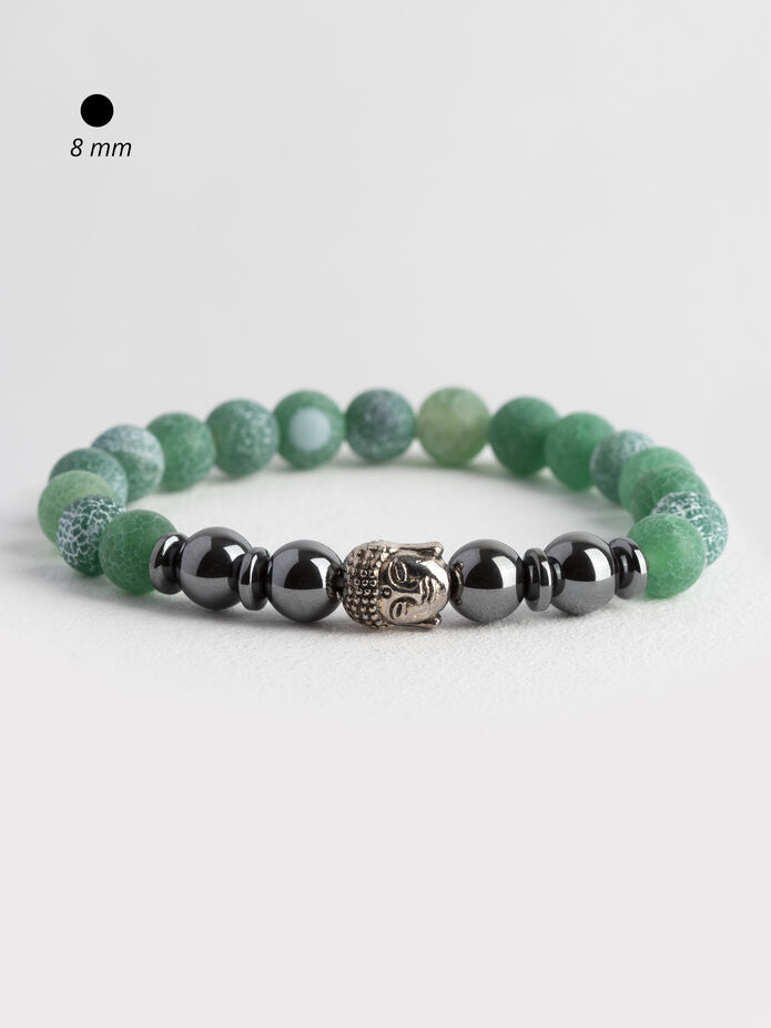 Krásný náramek z achátu a hematitu s motivem Buddhy je skvělým doplňkem ke každému outfitu. Průměr kuliček je 0,8 cm. Korálky jsou navlečené na gumičce. Obvod náramku je 18 cm. Náramek je vhodným dárkem pro muže i ženy.
