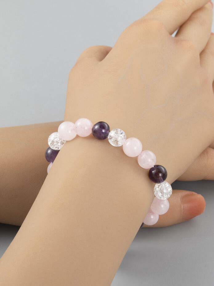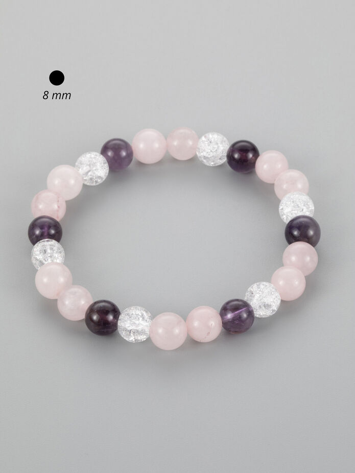Krásný náramek z korálků růženínu, křišťálu a ametystu je skvělým doplňkem ke každému outfitu, perfektně doladí a podtrhne nevšední vzhled každé dámy či muže.
