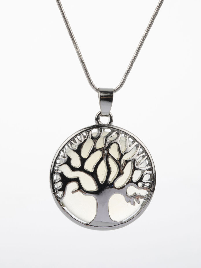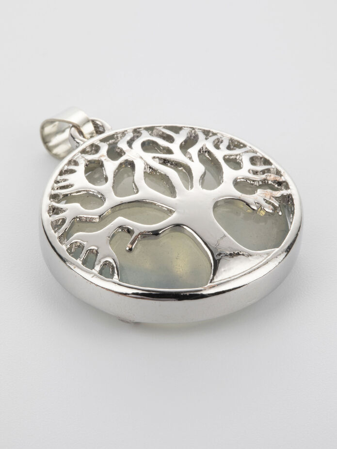 Přívěsek stříbrné barvy ve tvaru kruhu s motivem stromu života má průměr 2,7 cm. Z bižuterního kovu je zhotovena obruč s motivem stromu života, která je vykládána opálem. Jednoduché provedení působí velmi moderně, elegantně a nadčasově.