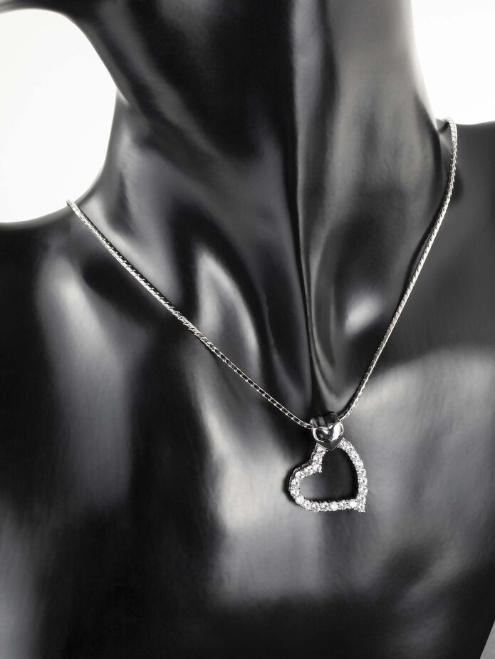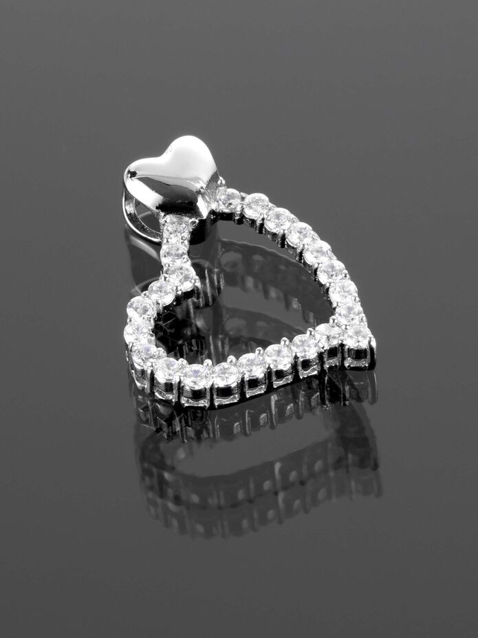 Přívěsek stříbrné barvy ve tvaru moderního srdíčka o rozměrech 1,9 x 2,2 cm je vykládán čirými krystaly o průměru 2 mm. Jednoduché provedení působí velmi moderně, elegantně a nadčasově. Perfektně doladí outfit každé ženy s oblibou výrazných šperků.