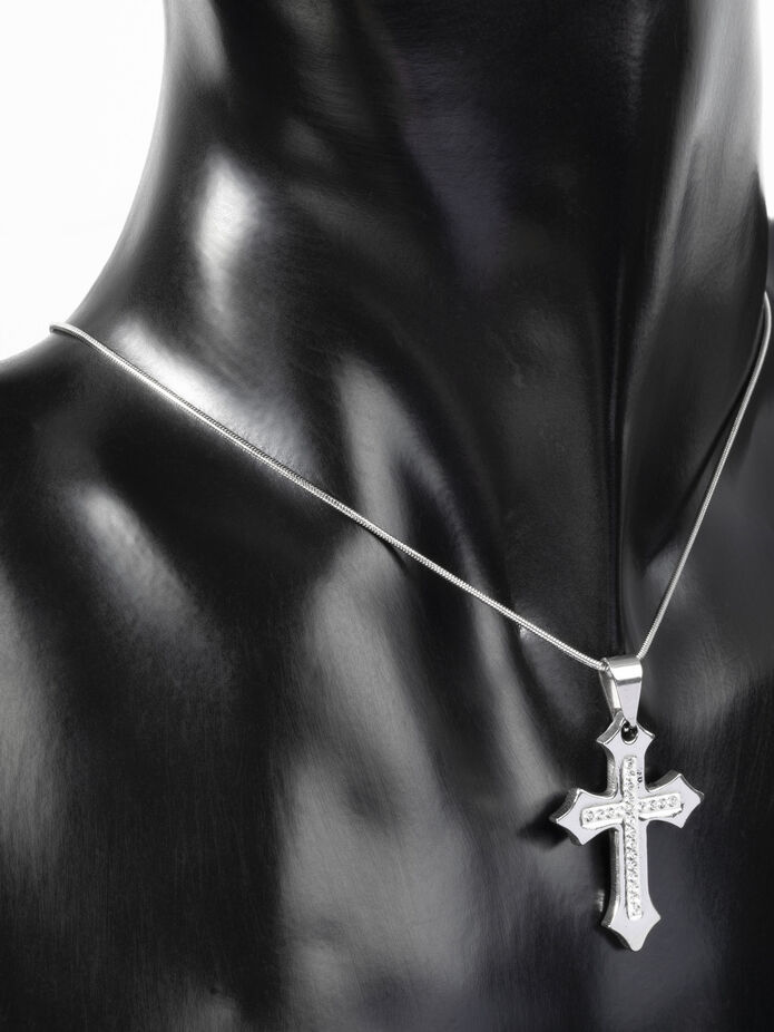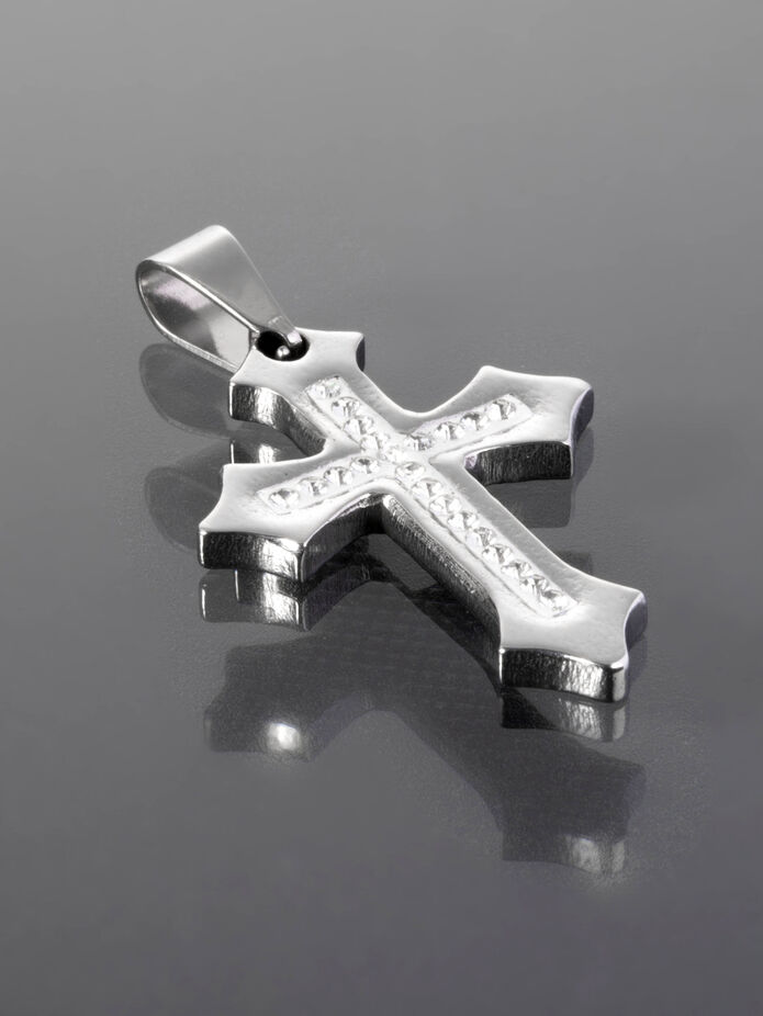 Rozměry přívěsku jsou cca 2,1 x 3 cm. Přívěsek stříbrné barvy je ve tvaru kříže, který je vykládán drobnými čirými krystaly, zpracování působí velmi vkusně a nadčasově.