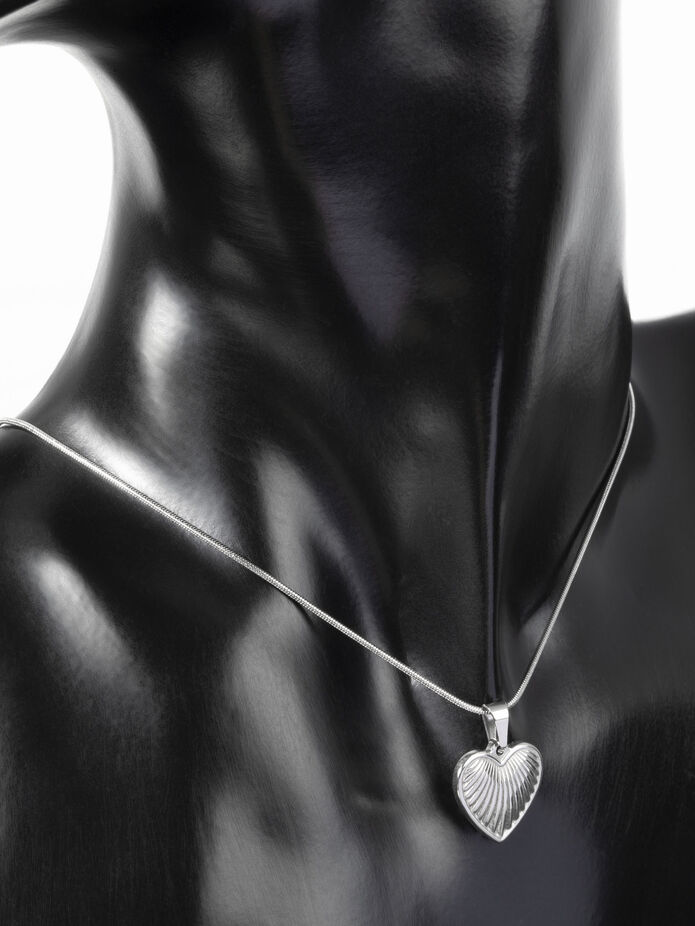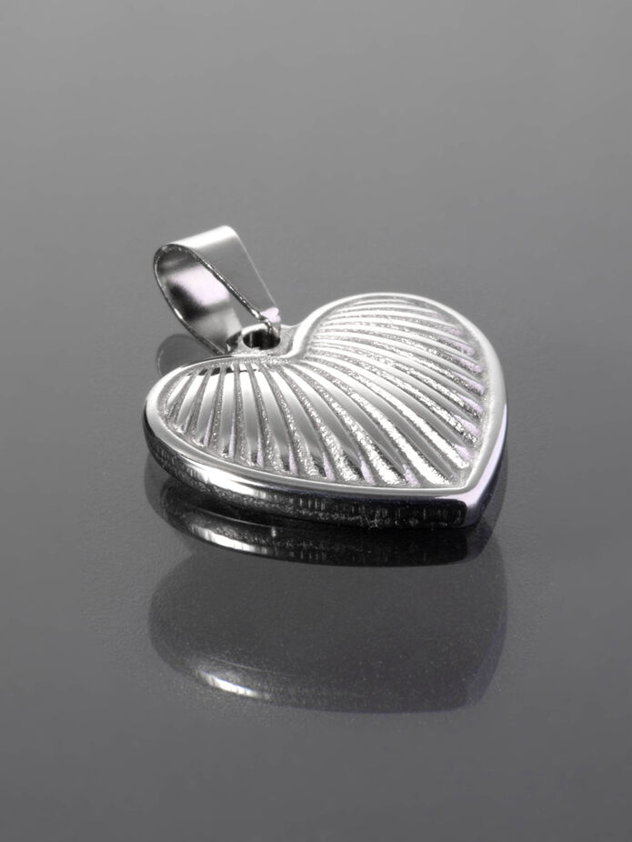 Rozměry přívěsku jsou cca 1,5 x 1,4 cm. Přívěsek stříbrné barvy je ve tvaru srdce, které je zdobeno rytými detaily.