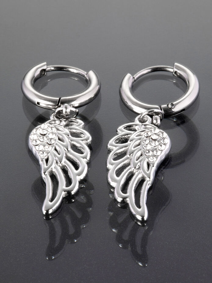 Luxusní kruhové náušnice z chirurgické oceli s přívěsky andělských křídel s drobnými čirými krystaly dokonale doladí jakýkoliv outfit.