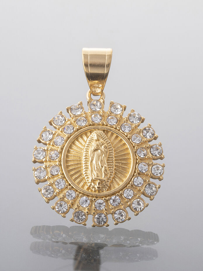 Nápadný kulatý přívěsek s motivem Panny Marie, zdobený třpytivými krystalky. Vyroben z odolné chirurgické oceli, ve zlaté nebo stříbrné barvě.