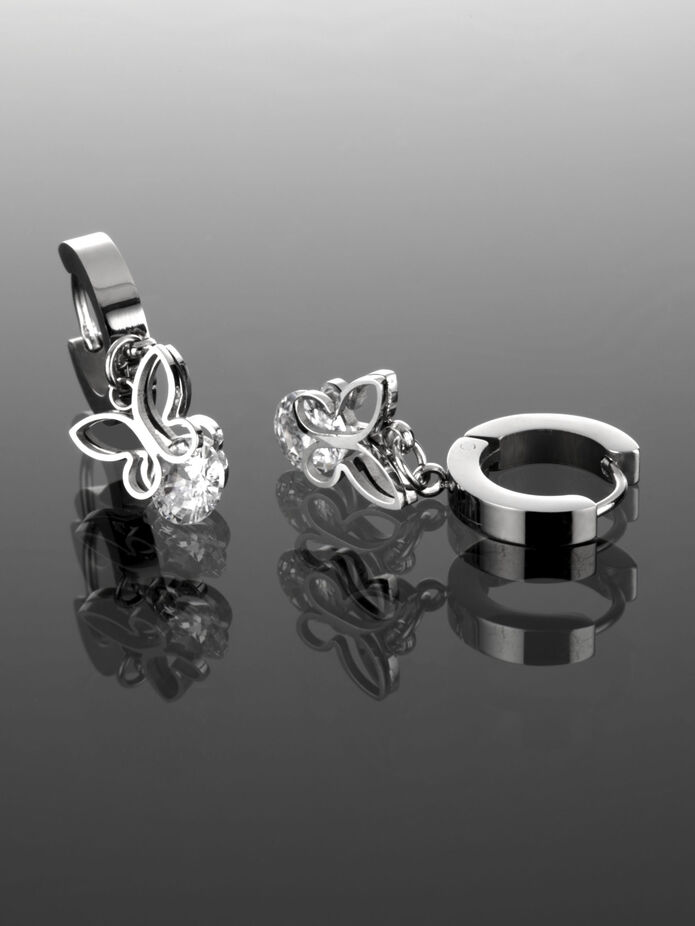 Luxusní kruhové náušnice z chirurgické oceli s přívěský motýlků s čirými krystaly jsou skvělým doplňkem k jakémukoliv outfitu. Šířka náušnic je 0,3 cm, průměr je 1,2 cm. Na náušnicích jsou ze spodu připevněny přívěsky s motýlky a čirým krystalem o rozměrech 1 x 1,2 cm. Celková délka náušnic je 2,7 cm. Zapínání je na francouzský patent, tento typ zapínání skvěle drží a tak náušnice samovolně nevypadnou.