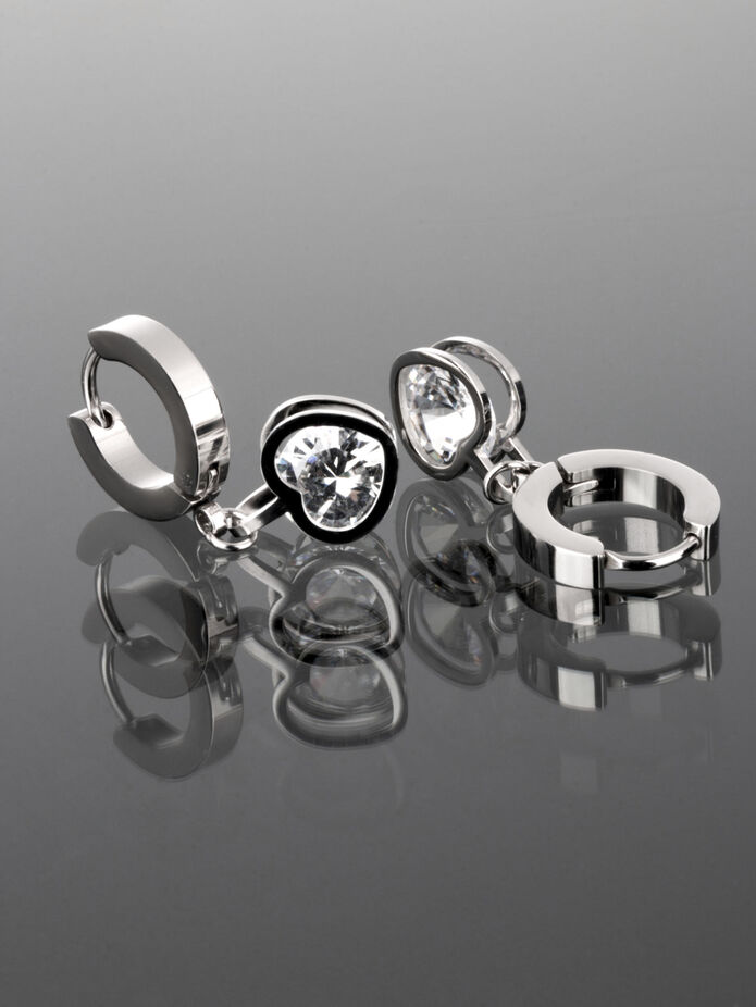 Luxusní kruhové náušnice z chirurgické s visacími srdíčky s čirými krystaly. Výška náušnic je 3 cm, průměr kroužků je 1,3 cm. Zapínání je na francouzský patent.