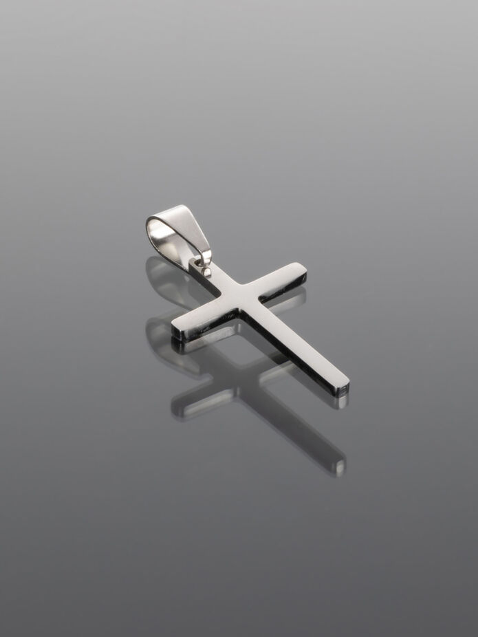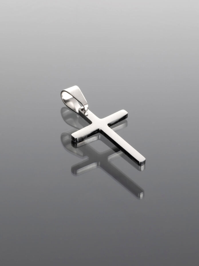 Přívěsek stříbrné barvy ve tvaru kříže o rozměrech 1,5 x 2,3 cm má šířku 2 mm. Jednoduché provedení působí velmi elegantně a nadčasově, lze dostat ve více velikostech, malé, střední a velké.