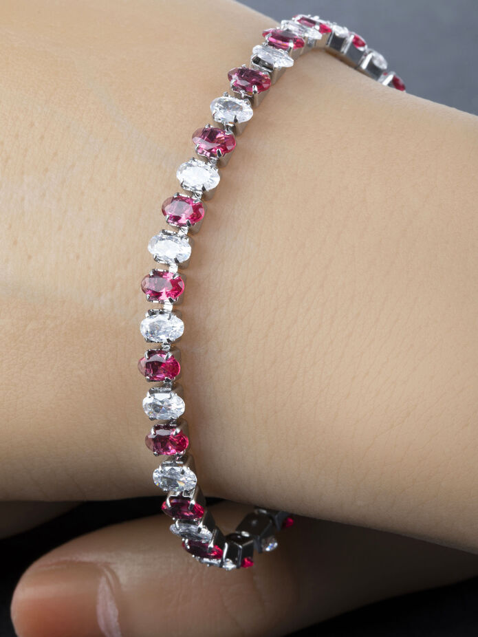 Luxusní náramek z chirurgické oceli s čirými a červenými oválnými krystaly je skvělým doplňkem k jakémukoliv outfitu. Délka náramku je 18 cm, šířka je 0,5 cm. Zapínání je na posuvnou sponu, tento typ zapínání krásně drží a tak náramek samovolně nespadne. Náramek je tvořen řetízkem stříbrné barvy, který je po celé délce vykládán oválnými krystaly dvou barev, zpracování působí opravdu vkusně a nadčasově.