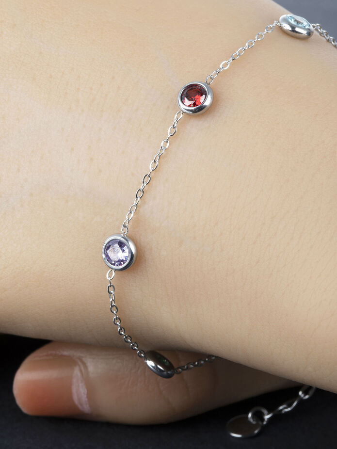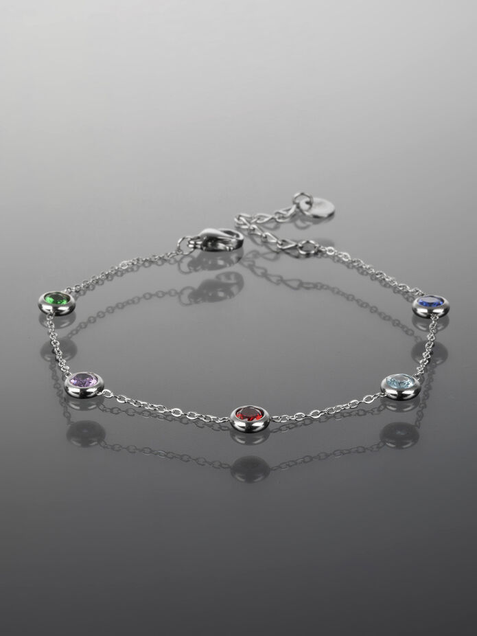 Luxusní náramek z chirurgické oceli s kolečky s barevnými krystaly je skvělým doplňkem k jakémukoliv outfitu. Délka náramku je nastavitelná cca od 18 do 21 cm, průměr kroužků je 0,6 cm. Zapínání je na karabinku, tento typ zapínání krásně drží a tak náramek samovolně nespadne. Náramek je tvořen drobným řetízkem stříbrné barvy, na kterém jsou malá kolečka s krystalem, zpracování působí opravdu vkusně a nadčasově.