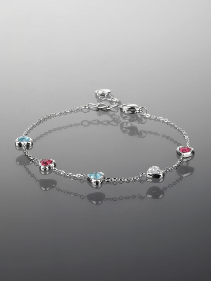 Luxusní náramek z chirurgické oceli se srdíčky s modrými a červenými krystaly je skvělým doplňkem k jakémukoliv outfitu.