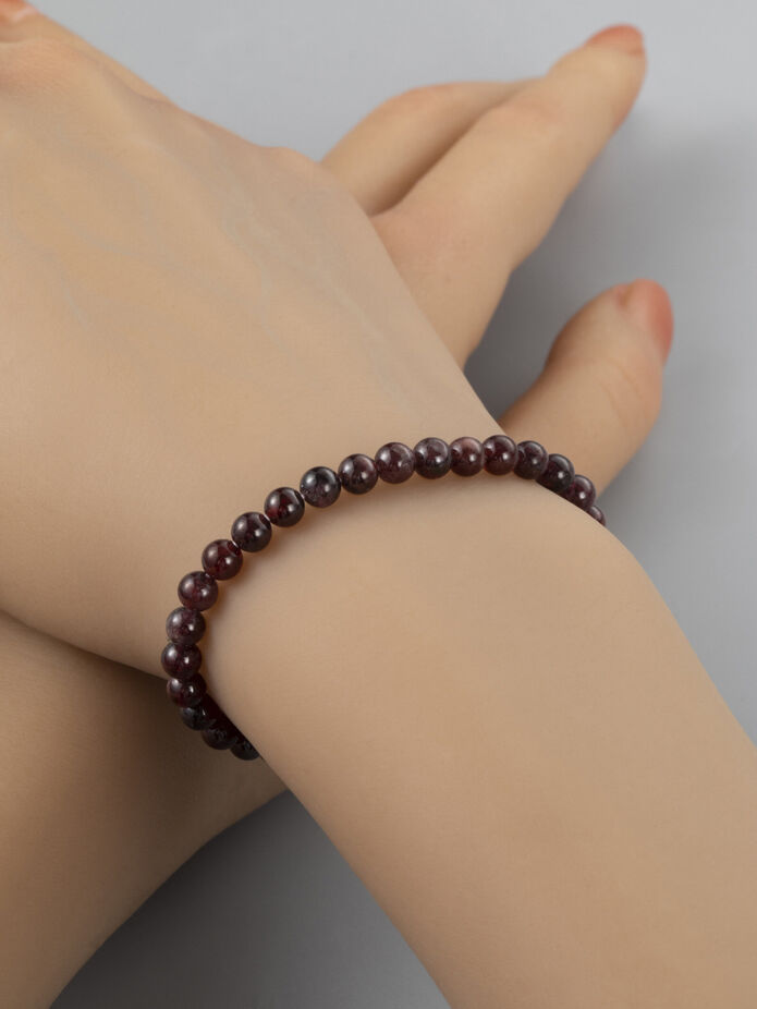 Krásný náramek z korálků granátu je skvělým doplňkem k jakémukoliv outfitu. Na světle se náramek na ruce lehce leskne a dodá ženě eleganci a šarm.