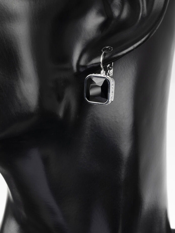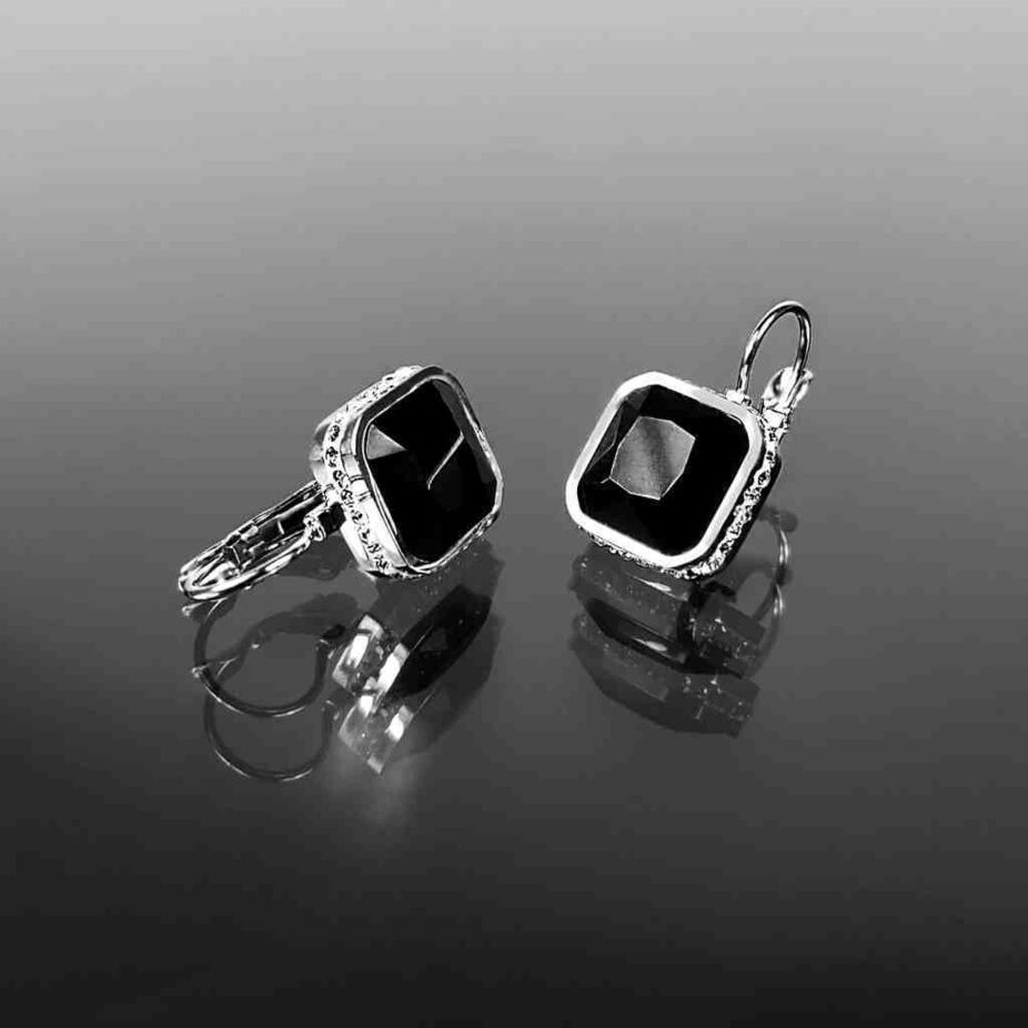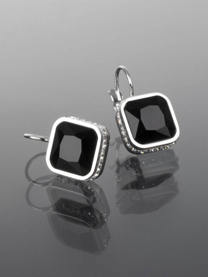 Luxusní náušnice z chirurgické oceli s výrazným černým krystalem ve tvaru čtverce s drobnými čirými krystaly jsou skvělým doplňkem k jakémukoliv outfitu. Délka náušnic je cca 2,3 cm, délka hrany je 1,1 cm. Zapínání je na dámský patent, tento typ zapínání skvěle drží a tak náušnice samovolně nevypadnou. Náušnice stříbrné barvy jsou zdobeny masivním černým krystalem ve tvaru čtverce, který je po obvodu zdoben drobnými čirými krystaly, zpracování působí opravdu vkusně a nadčasově.