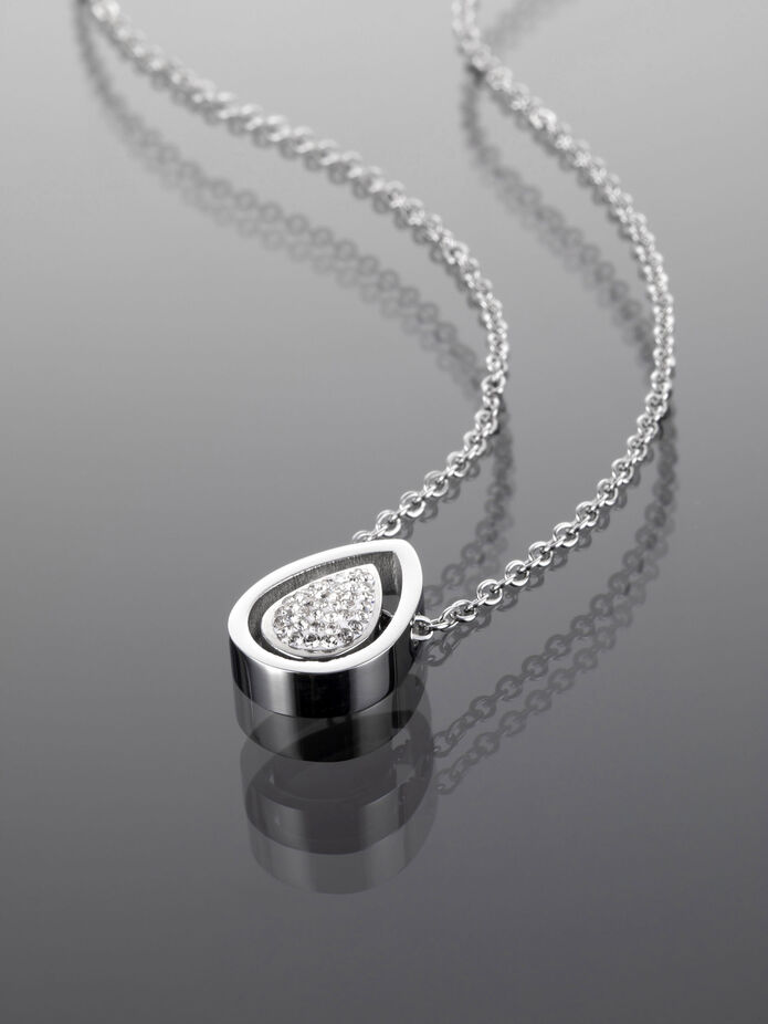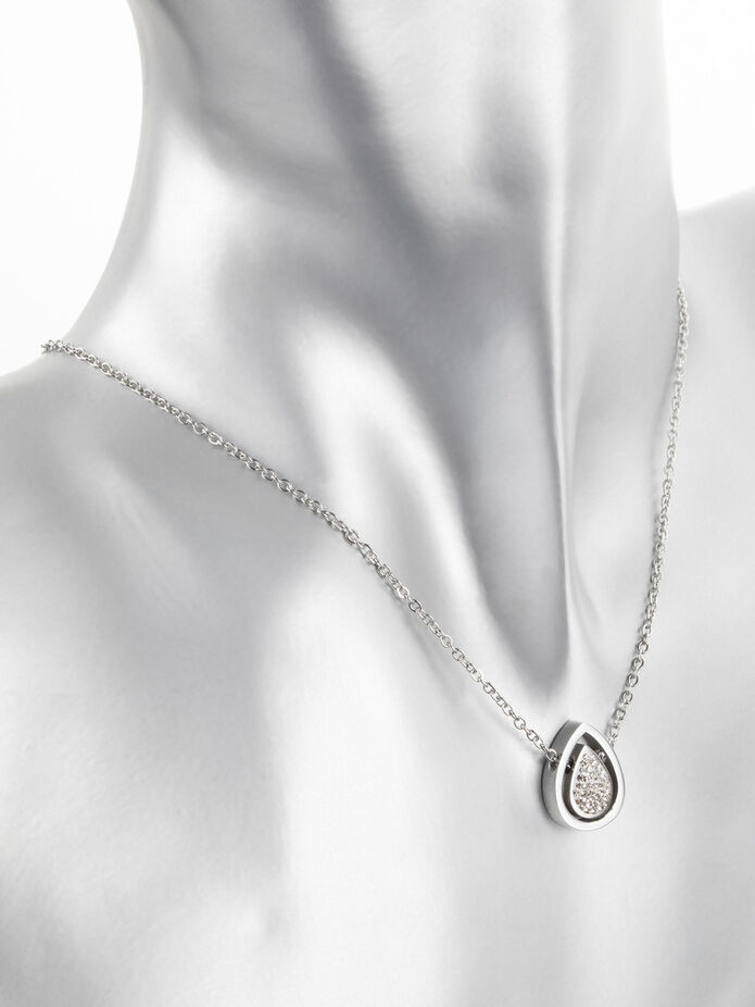 Luxusní náhrdelník z chirurgické oceli ve tvaru kapky vykládaný čirými krystaly je moderním a elegantním doplňkem hodícím se ke každému outfitu. Vhodný i pro alergiky.