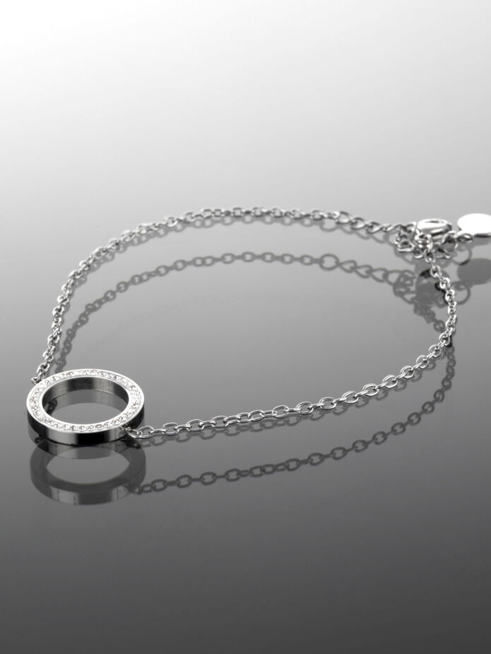 Krásný řetízkový náramek z chirurgické oceli s kroužkem vykládaným čirými krystaly je moderním doplňkem vhodným ke každému outfitu. Vhodný i pro alergiky.