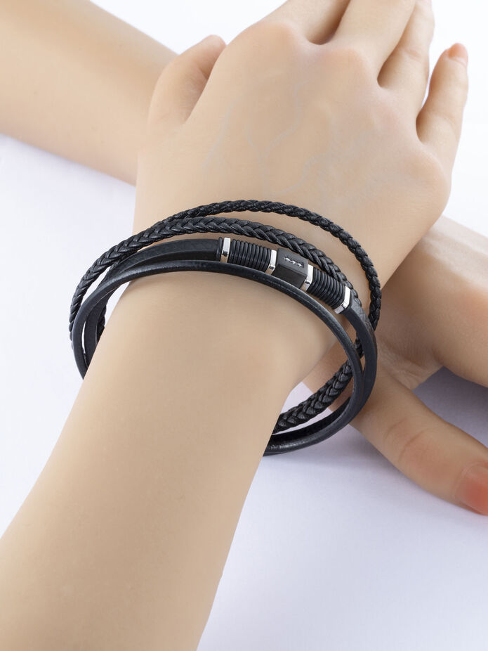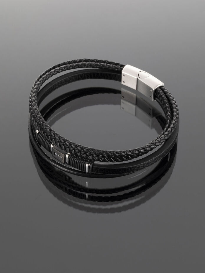 Luxusní pánský náramek z kůže s chirurgickou ocelí a čirými krystaly je skvělým doplňkem k jakémukoliv outfitu. Obvod náramku je cca 24 cm, šířka kožených řemínků je 1,1 - 2,3 cm. Zapínání je zacvakávací, tento typ zapínání skvěle drží a tak náramek samovolně nespadne. Náramek je tvořen koženými řemínky černé barvy a kovovými detaily z chirurgické oceli s drobnými čirými krystaly.