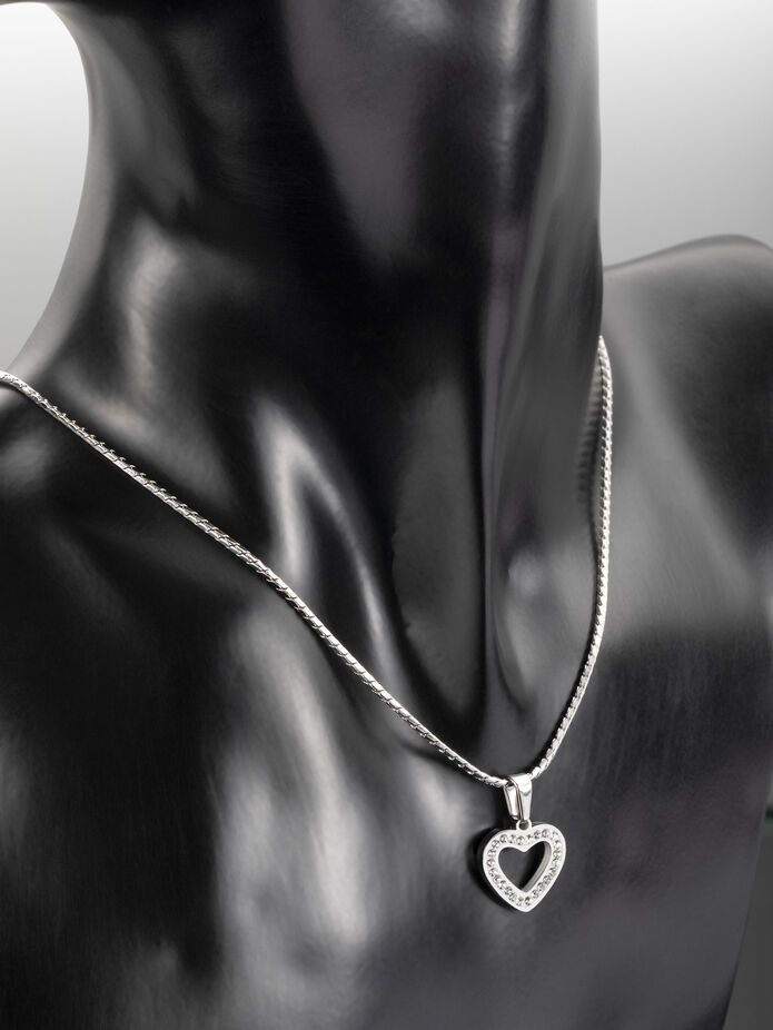 Krásný přívěsek ve tvaru drobného srdíčka s drobnými čirými krystaly z chirurgické oceli je skvělým doplňkem k jakémukoliv outfitu.