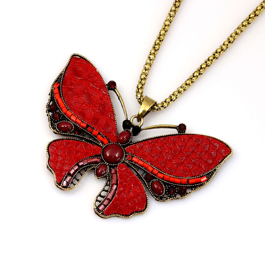 Luxusní náhrdelník ve tvaru motýla je moderním doplňkem ke každému outfitu. K dostání je ve více barevných provedeních - zelená, multicolor, červená a hnědá.