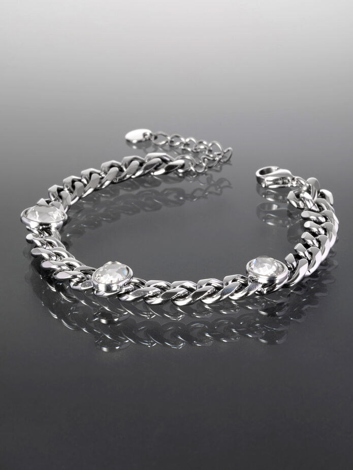 Luxusní masivní náramek z chirurgické oceli s ovály s čirými krystaly je skvělým doplňkem k jakémukoliv outfitu. Délka náramku je nastavitelná cca od 18 do 21 cm, šířka náramku je 0,6 cm, rozměry oválů jsou 0,7 x 1 cm. Zapínání je na karabinku, tento typ zapínání krásně drží a tak náramek samovolně nespadne. Náramek je tvořen masivním řetízkem stříbrné barvy, na kterém jsou připevněny ovály s krystaly, zpracování působí opravdu vkusně a nadčasově.