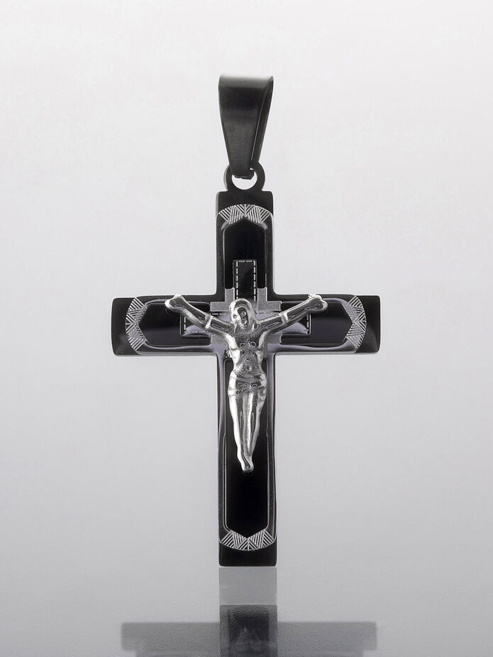 Výrazný přívěsek z chirurgické oceli s detailně zpracovaným motivem ukřižovaného Ježíše.