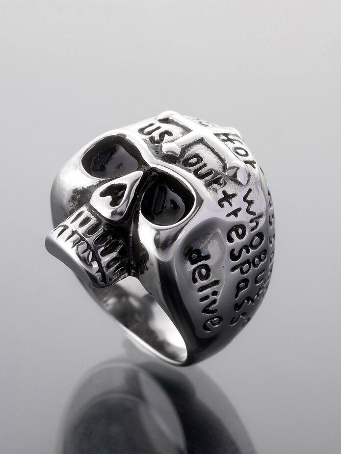 Tento výrazný prsten z kvalitní chirurgické oceli kombinuje sílu, eleganci a osobitý styl. Horní část prstenu je zdobena lebkou a boky rytým nápisem, čímž přitahuje pozornost svou temnou elegancí.