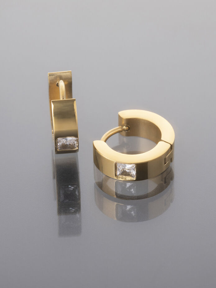 Jsou vyrobeny z leštěné chirurgické oceli, která je hypoalergenní, odolná proti poškrábání a stálobarevná – ideální volba i pro citlivou pokožku. S průměrem Ø 1,3 cm si jistě najdou místo ve vaší sbírce módních doplňků.
