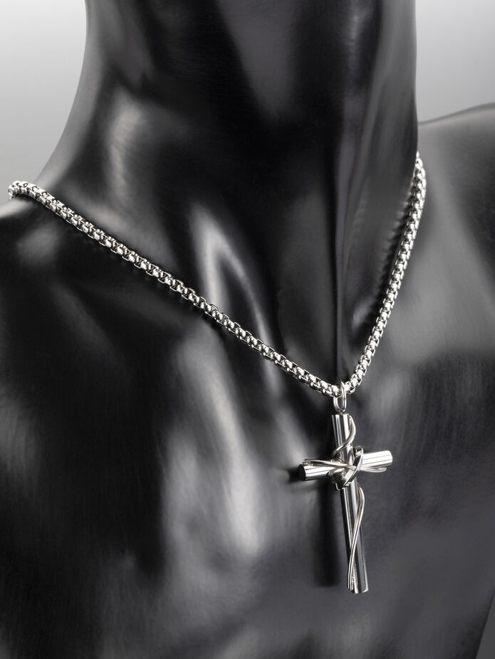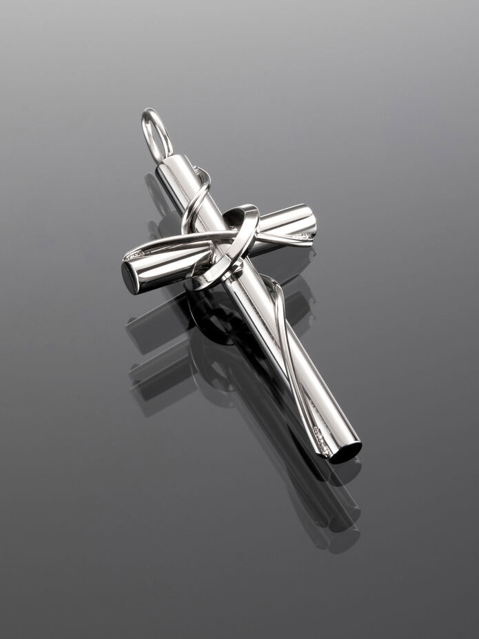 Přívěsek stříbrné barvy ve tvaru kříže o rozměrech 2,1 x 3,2 cm má šířku 4 mm. Kříž je zdoben omotaným drátem a kruhem, který symbolizuje trnovou korunu, jednoduché provedení působí velmi moderně, elegantně a nadčasově.