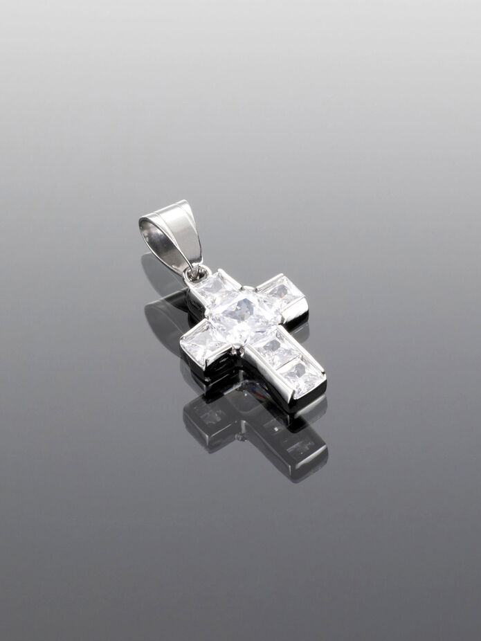 Přívěsek stříbrné barvy ve tvaru kříže o rozměrech 1,4 x 1,9 cm má šířku 4 mm. Kříž je zdoben hranatými čirými zirkony s délkou hrany 4 mm, uprostřed je umístěn krystal větší, délka jeho hrany je 6 mm, jednoduché provedení působí velmi moderně, elegantně a nadčasově.