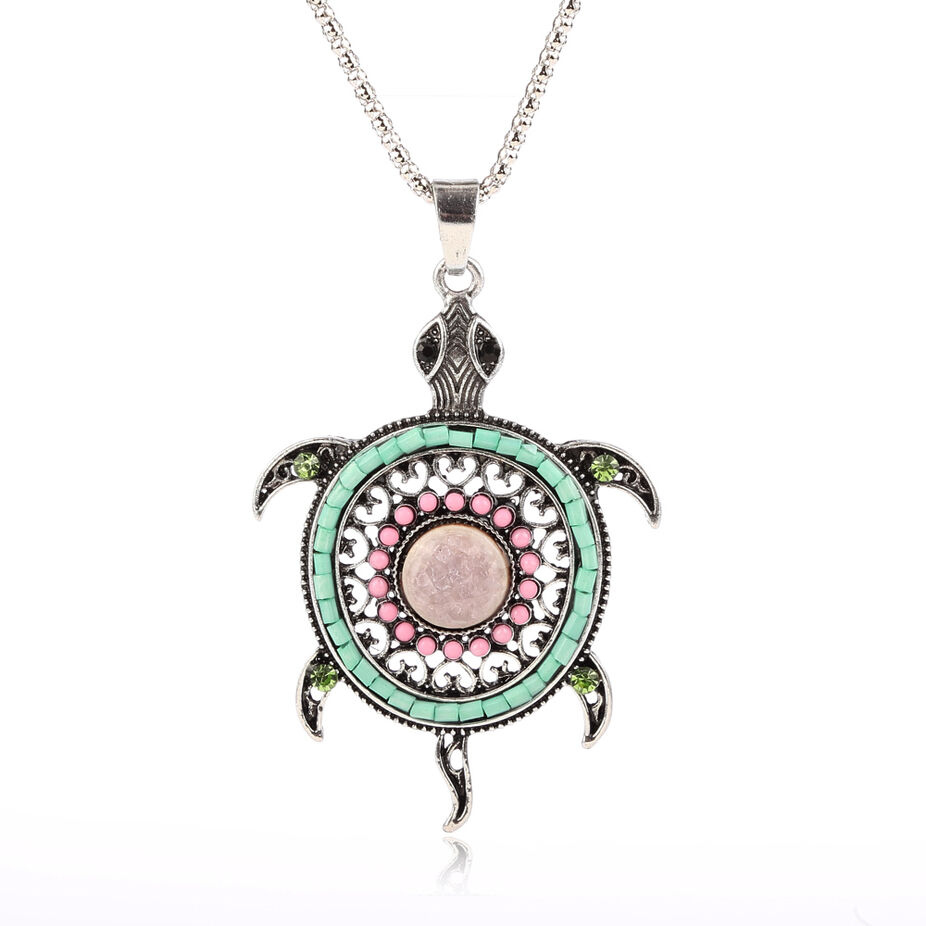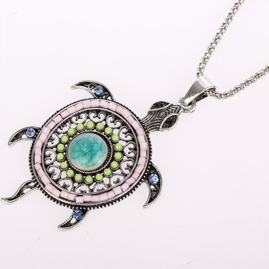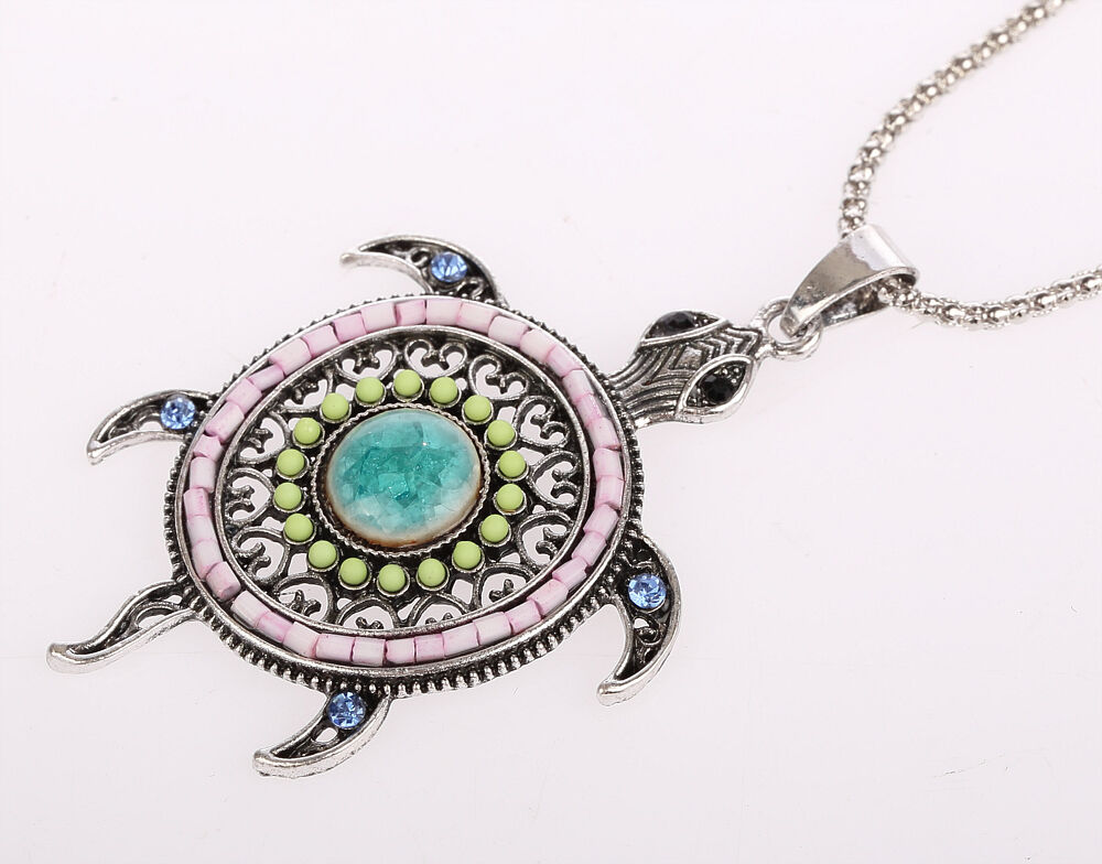 Přívěsek se želvičkou v etno stylu zdobí barevné korálky a krystalky. Náhrdelník opatřený patinou bude oblíbeným módním doplňkem všech žen a dívek, které mají rády netradiční šperky.