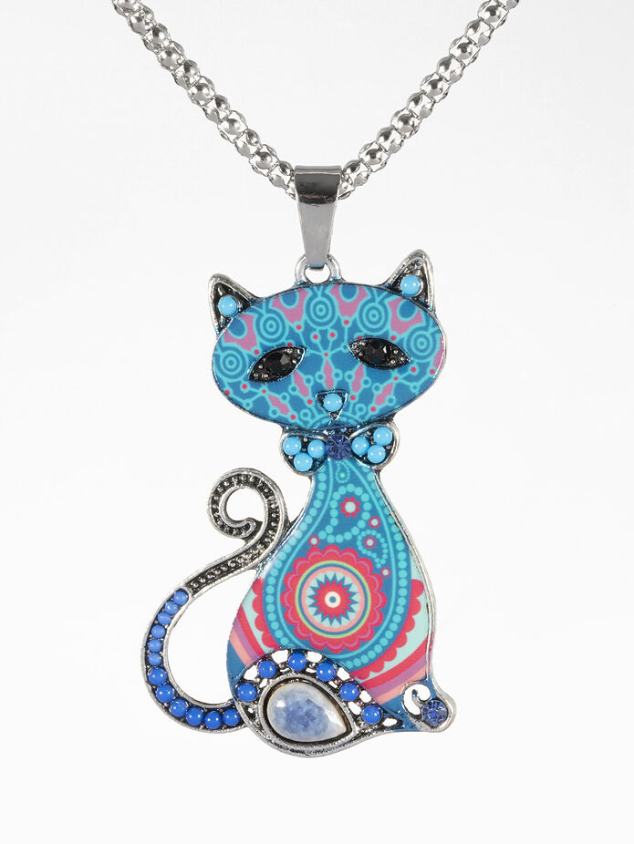 Kouzelný náhrdelník, který oživí každý outfit. Tento náhrdedlník je z obecného kovu stříbrné barvy a řetízek je dlouhý (70cm). Přívěsek má podobu kočky, která je osazena barevnými korálky a krystalky. Zapínání řetízku je na karabinku. Vyberte si z mnoha barevných variant a udělejte si radost tímto kouzelným doplňkem!