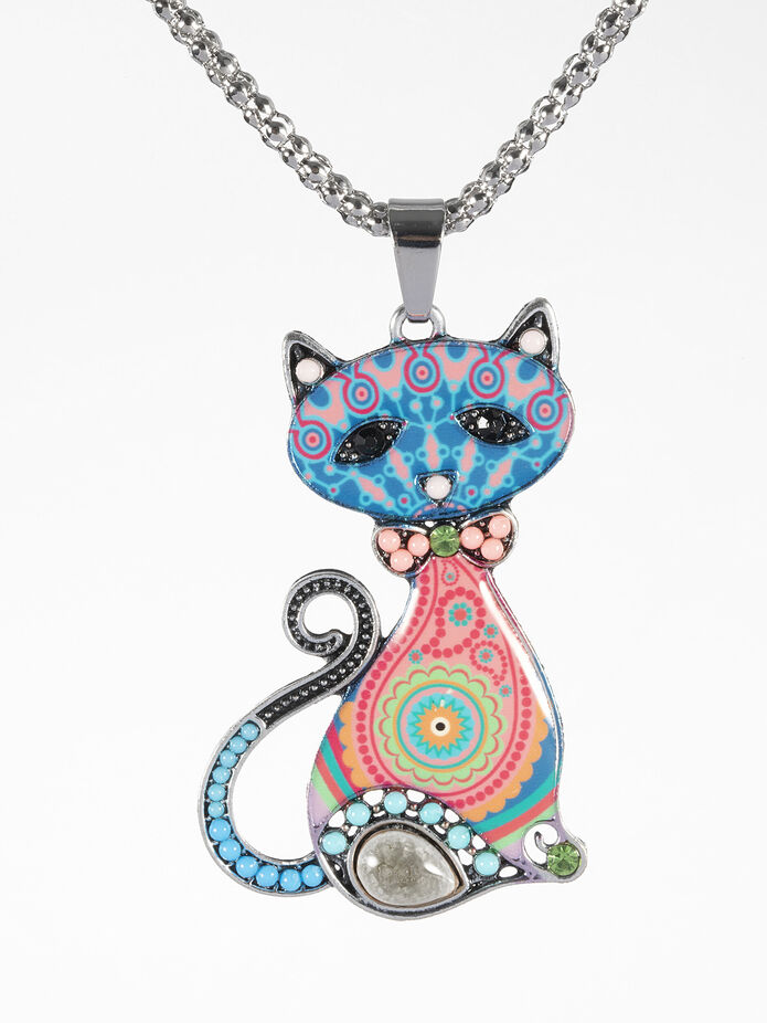 Kouzelný náhrdelník, který oživí každý outfit. Tento náhrdedlník je z obecného kovu stříbrné barvy a řetízek je dlouhý (70cm). Přívěsek má podobu kočky, která je osazena barevnými korálky a krystalky. Zapínání řetízku je na karabinku. Vyberte si z mnoha barevných variant a udělejte si radost tímto kouzelným doplňkem!
