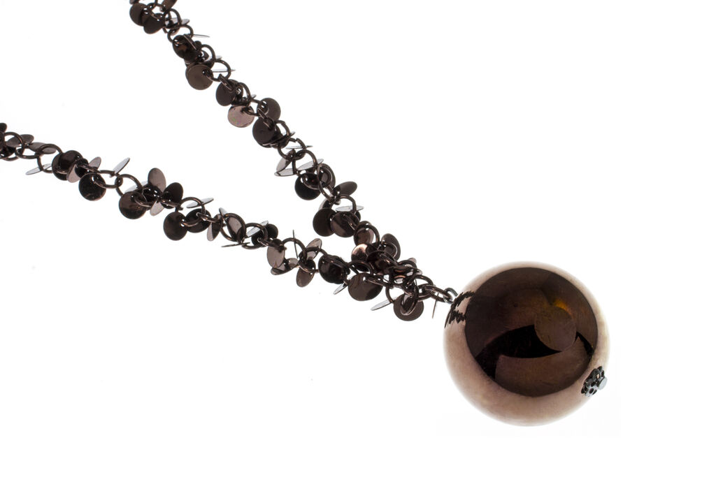 Náhrdelník s koulí a dlouhým řetízkem z flitrů bude originálním módním doplňkem na každou párty. Masivní šperk se hodí pro sebevědomou ženu s jedinečným módním vkusem.
