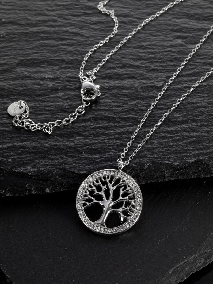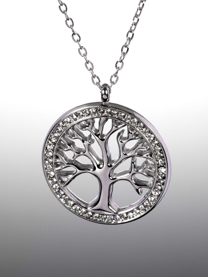 Krásný náhrdelník z chirurgické oceli s motivem stromu života s drobnými čirými krystaly je skvělým doplňkem k jakémukoliv outfitu.