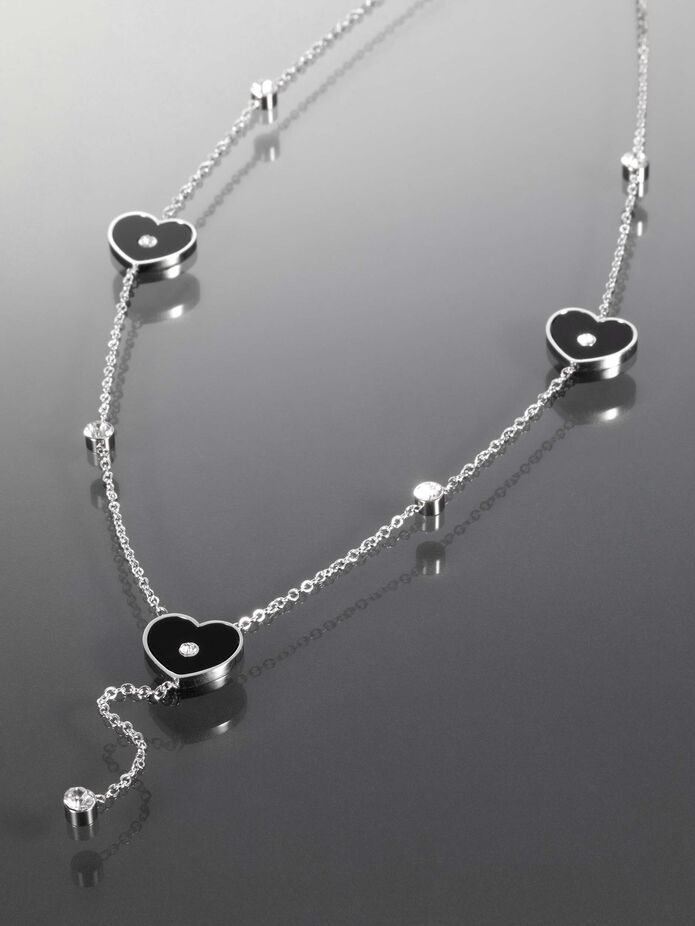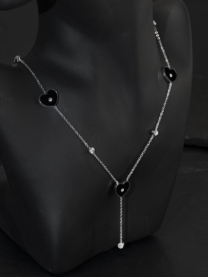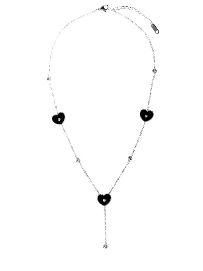Tento kouzelný náhrdelnílk si nesmíte nechat ujít! Náhrdelník je z chirurgické oceli, která je hypoalergenní a nemění barvu.Náhrdelník je zdoben černými srdíčky a krystalky. Zapínání náhrdelníku je na karabinku, dle zapnutí karabinky se délka liší. Vykouzlete i vy úsměv na tváři s tímto krásným šperkem.