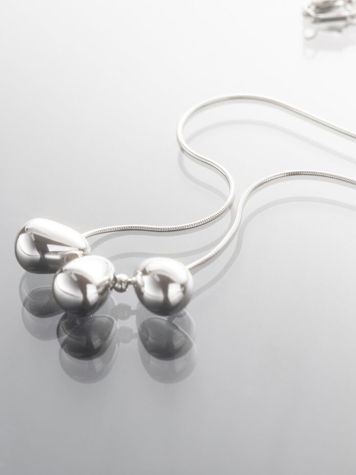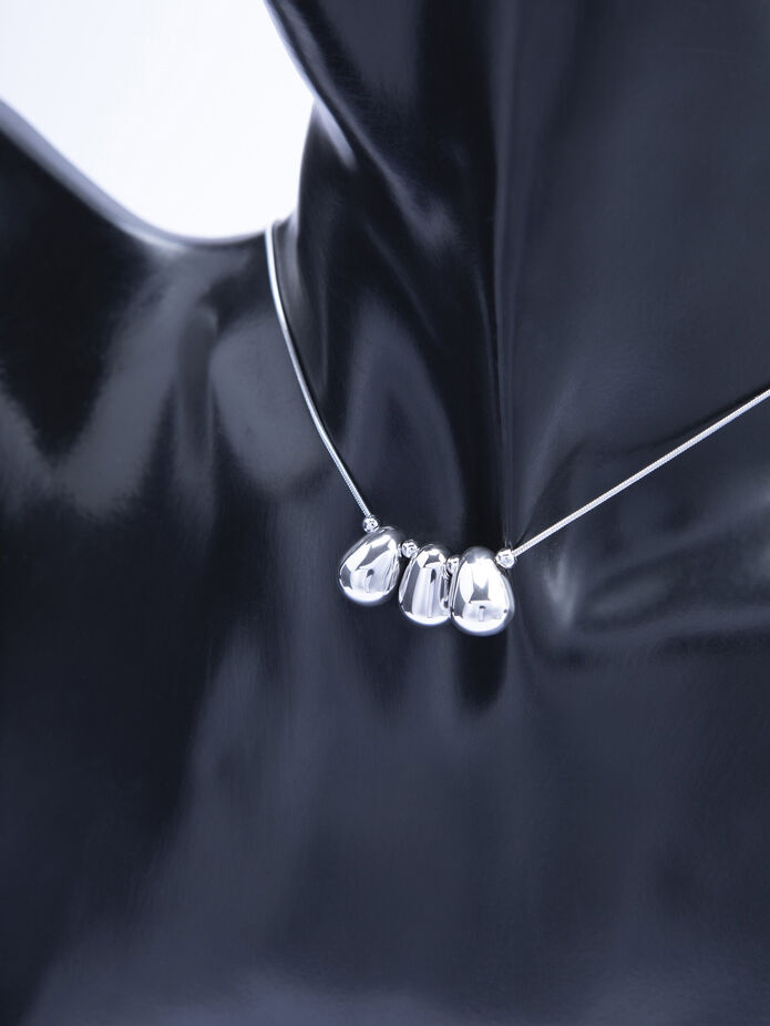 Jemný řetízek z chirurgické oceli s přívěskem ve tvaru tří lesklých kovových kapek je skvělým doplňkem k jakémukoli outfitu. Délka náhrdelníku je nastavitelná cca od 40 do 45 cm. Rozměry jedné kapky jsou cca 1 x 0,8 cm.
