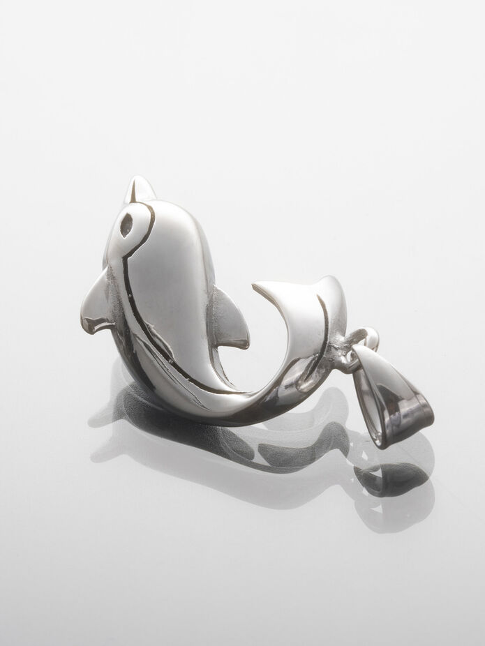Nápadný přívěsek z leštěné chirurgické oceli, která nemění barvu a je hypoalergenní. Přívěsek s motivem plovoucí delfínmá délku cca 3 cm a je velmi precizně zpracován. Pomocí velkého poutka ho můžete zavěsit na řetízek nebo na kožený proužek.