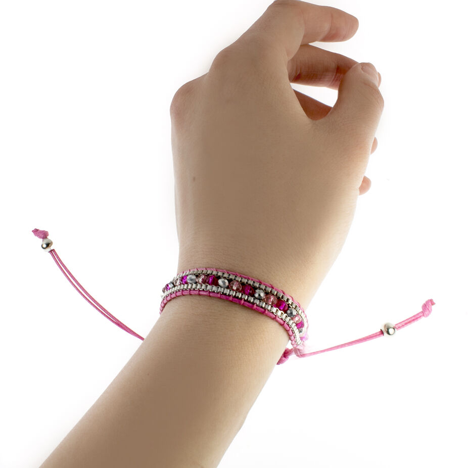 Náramek v pastelových barvách z kombinace korálků, tkaniny a kamínků se stahovacím zapínáním je krásným módním doplňkem pro každý den.