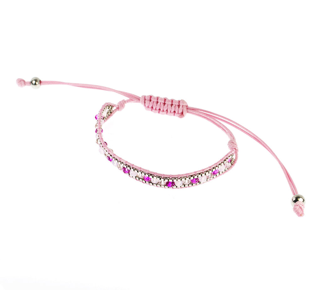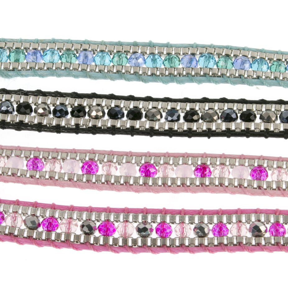 Náramek v pastelových barvách je hitem letošního léta! Náramek je vyroben z kombinace několika materiálů - koralků, tkaniny a kamínků. Podklad náramku tvoří tři řady řetízků, mezi které je vpletena tkanina a úzký pásek kamínků. Náramek je opatřen stahovacím zapínáním, díky kterému náramek snadno nasadíte, stačí pouze zatáhnout za tkaničku.