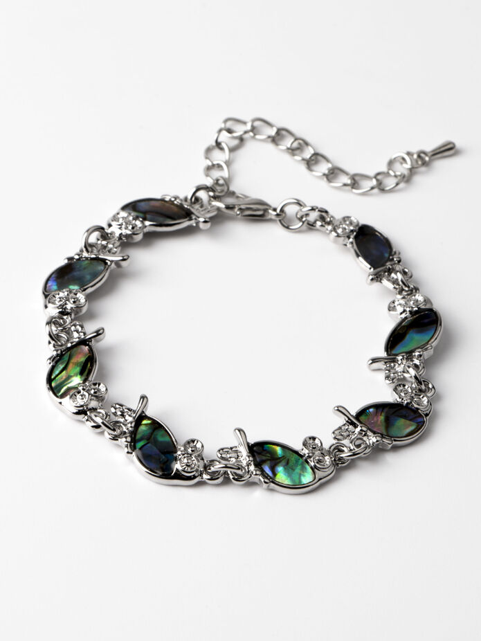 Náramek s paua mušlí zasazený do bílého kovu, neobsahujícího nikl.