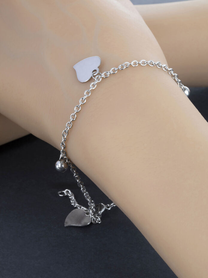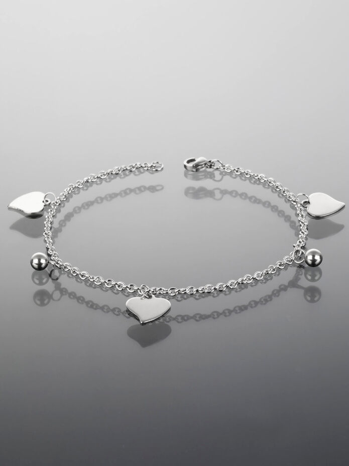 Tento kouzelný náramek si zamilujete! Náramek je z chirurgické oceli, která nemění barvu a je hypoalergenní. Na náramku najdete přívěsky ve tvaru srdcí a malé kuličky. Zapínání náramku je na karabinku. Vykouzlete úsměv na tváři své drahé polovičce či blízké tímto krásným doplňkem!