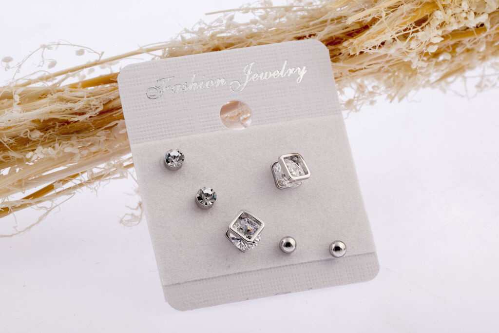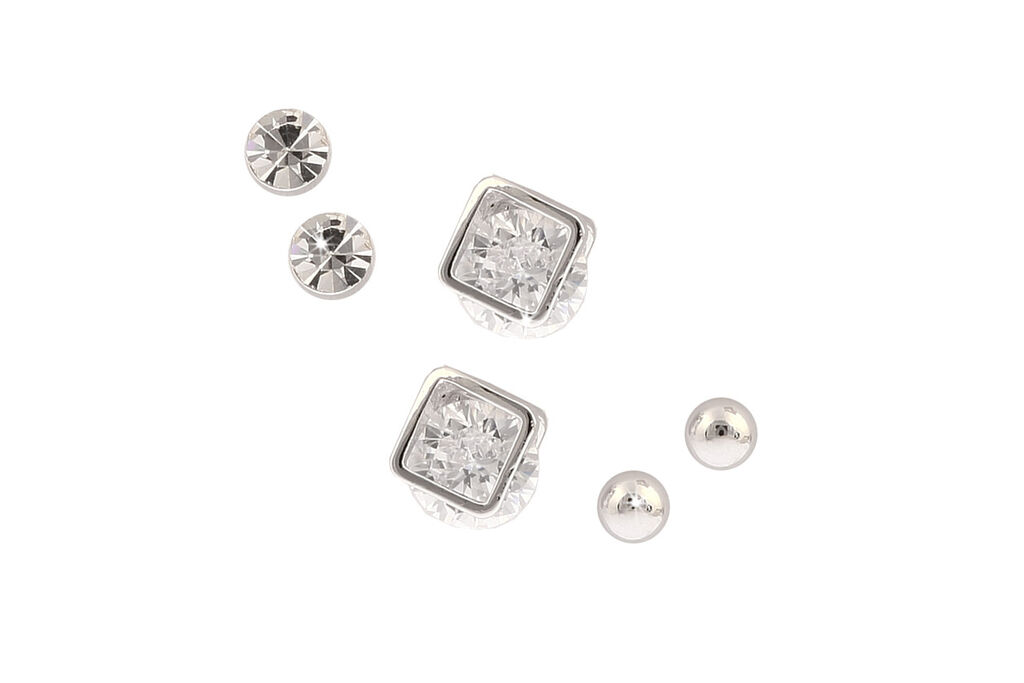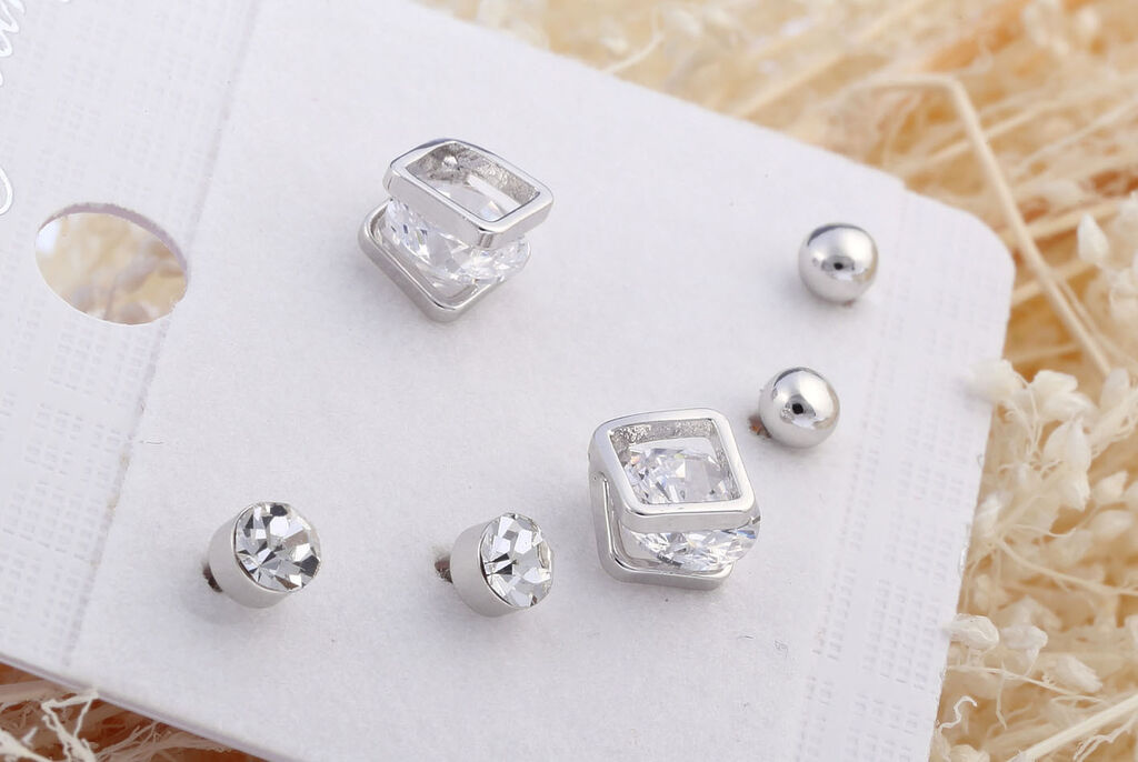 Náušnice 3 druhy se zirkonem stříbrné barvy jistě potěší každou slečnu i dívku. Náušničky jsou zajímavé broušenými zirkony. Jeden druh jsou pouze čisté zirkony, druhé jsou jen malé kuličky a třetí je zirkon, který po stranách drží čtverečky z přední i zadní strany. Šperky jsou vyrobené z bižuterního kovu. Náušničky jsou řešené na puzety. Tyto moderní šperky se hodí pro každou událost, ať už jdete do školy, klubu či na pracovní jednání.