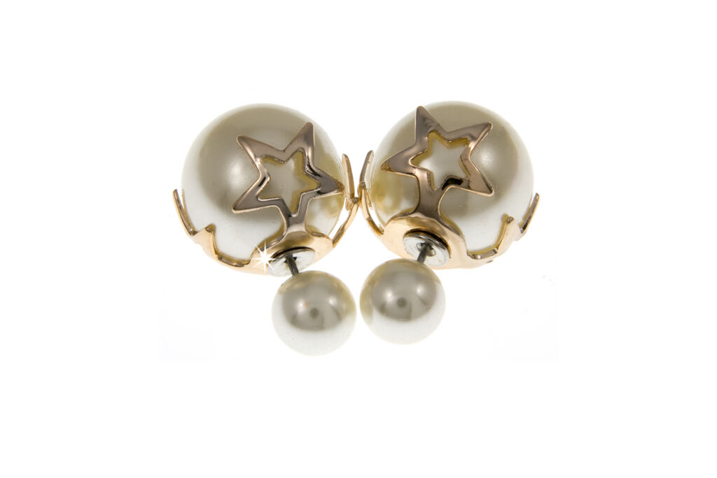 Jste ráda středem pozornosti? Moderní oboustranné náušnice jistě upoutají pozornost Vašeho okolí. Náušnice se skládají ze dvou různě velkých kuliček v perleťových odstínech. Větší z kuliček je navíc ozdobena hvězdou zlaté barvy. Náušnice se zapínají stejně jako typ pecky, malá kulička je opatřena trnem a namísto puzety použijete k připevnění druhou kuličku.