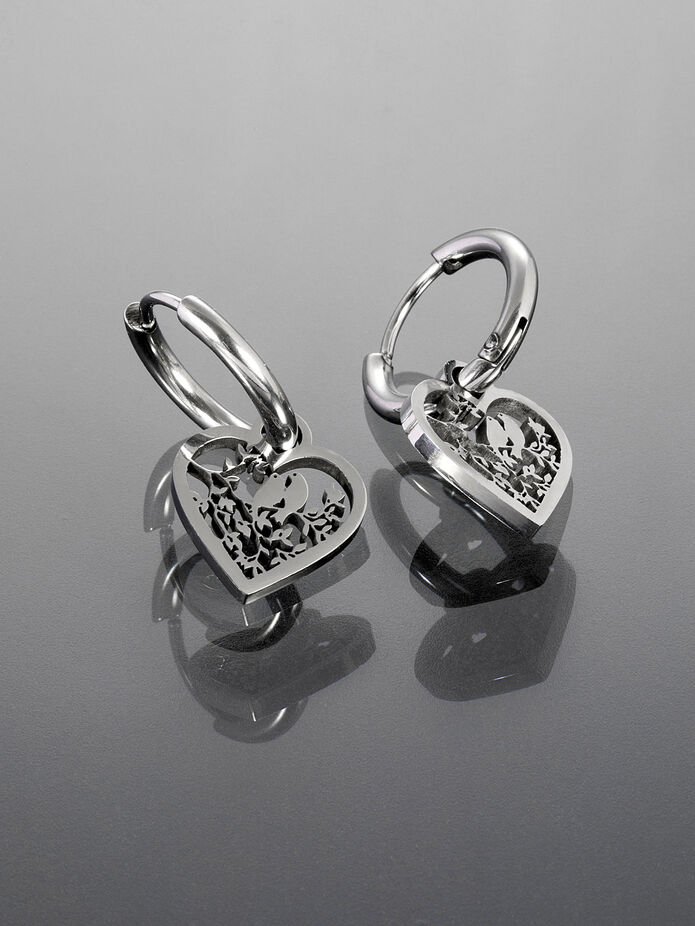 Tyto náušničky oživí každý váš outfit svým zajímavým vzhledem! Náušničky jsou z chirurgické oceli, která nemění barvu a je hypoalergenní. Náušničky mají podobu kruhu, na kterém visí srdíčko, ve kterém jsou větvičky a ptáčci. Udělejte si i vy radost tímto nadčasovým šperkem!