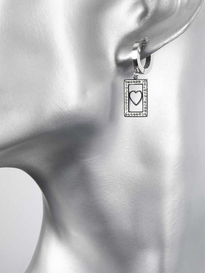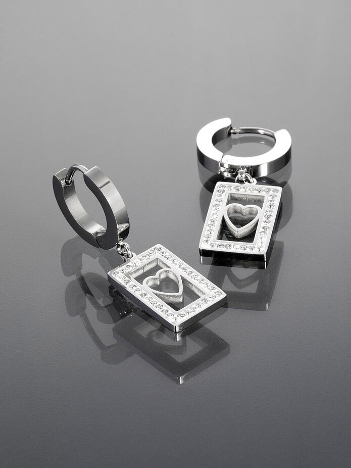 Tyto náušničky oživí každý váš outfit svým zajímavým vzhledem! Náušničky jsou z chirurgické oceli, která nemění barvu a je hypoalergenní. Náušničky mají podobu kruhu, na kterém visí srdíčko v obdélníku, který je osazen krystalky. Udělejte si i vy radost tímto nadčasovým šperkem!