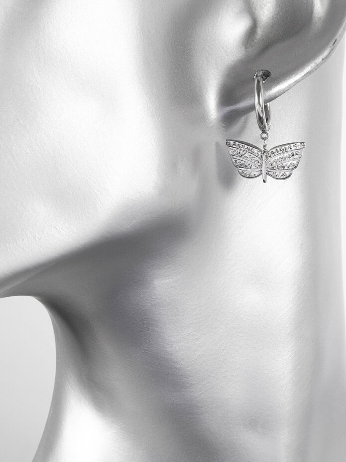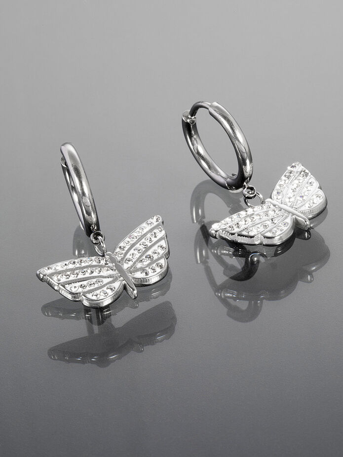 Tyto stylové náušničky si zamilujete. Náušničky jsou z chirurgické oceli, která nemění barvu a je hypoalergenní. Náušničky mají podobu kruhů s motýlky osazenými krystalky. Udělejte si i vy radost tímto nadčasovým šperkem!