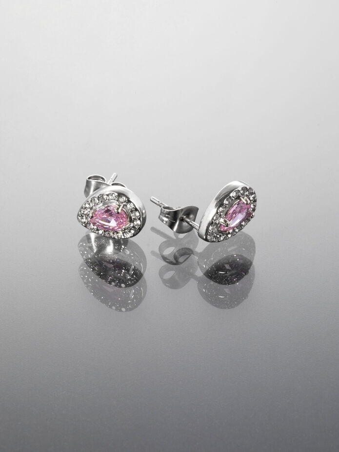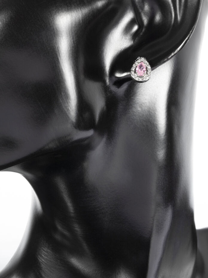 Stylové náušničky v podobě růžového krystalku tvaru kapky a drobných stříbrných krystalků osazených po okraji. Krystal je usazen do stříbrné kovové konstrukce a náušničky mají zapínání na klasickou puzetu. Udělejte si i vy radost tímto elegantním šperkem a oživte své outfity kapkou barvy.