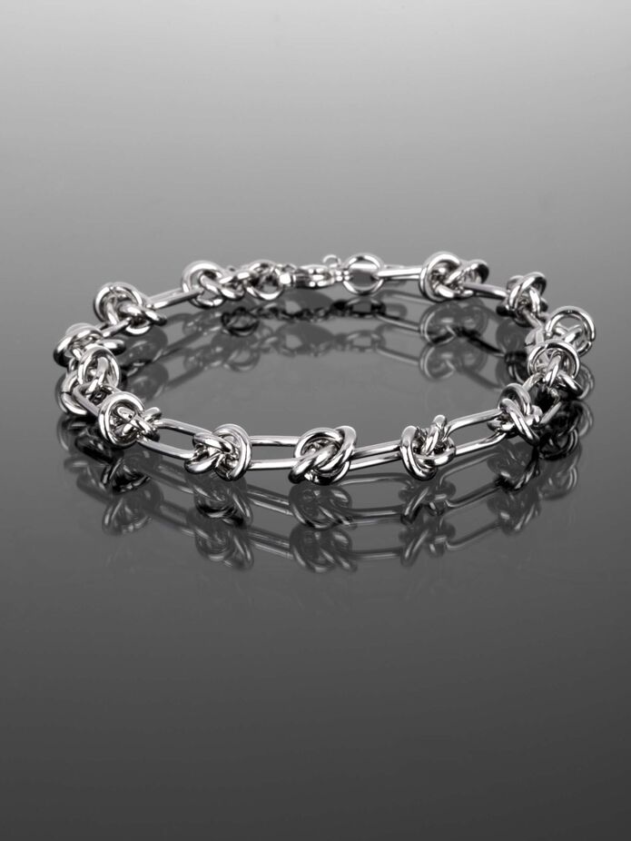 Řetězový náramek z lesklé chirurgické oceli, působí lehce rebelským dojmem.