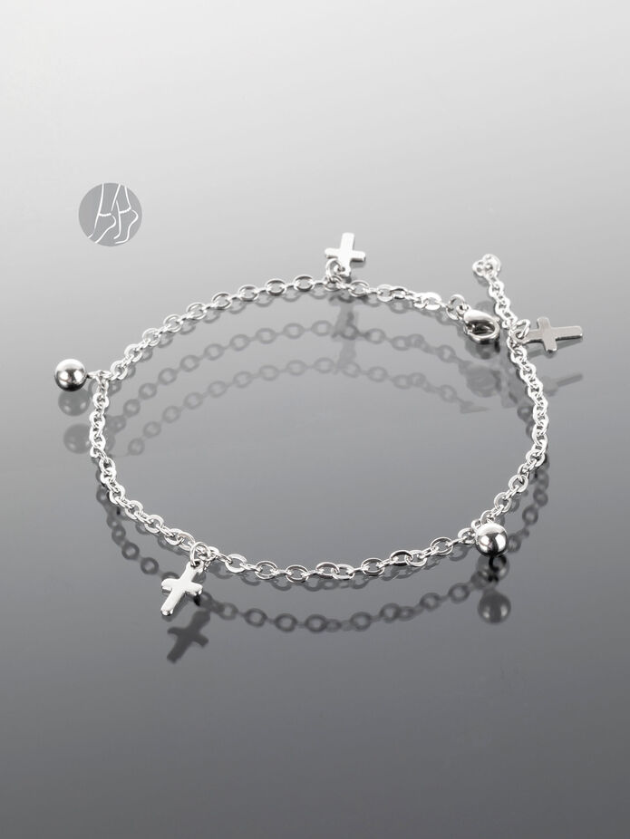 Pevný řetízek na nohu z chirurgické oceli s křížky a kuličkami. Délka řetízku je nastavitelná od 21 cm do 26 cm. Řetízek je kvalitně zpracován, nemění barvu a je vhodný i pro alergiky.